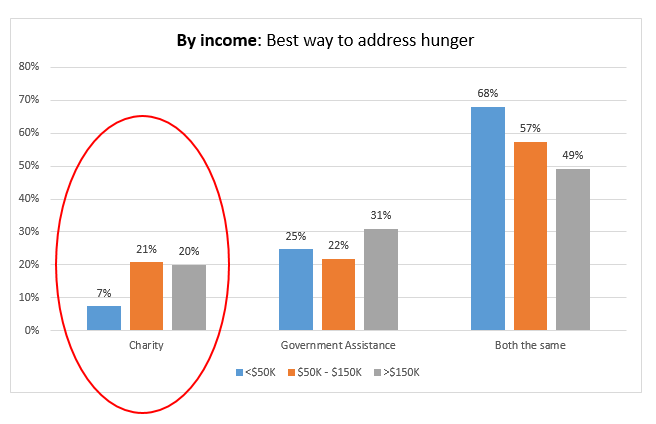 Respondents who live in households with annual incomes of less than $50,000, have only about a third as much confidence in charity as those making over $50,000. This is particularly interesting because the “blue respondents” (those from households with incomes under $50,000 per year), are the very people who are frequently on the receiving end of both charity and government assistance. With only 7% of the blue respondents thinking that charity is the best way to address hunger, it is pretty clear that those who know best do not think that the job can be done best through charity alone.